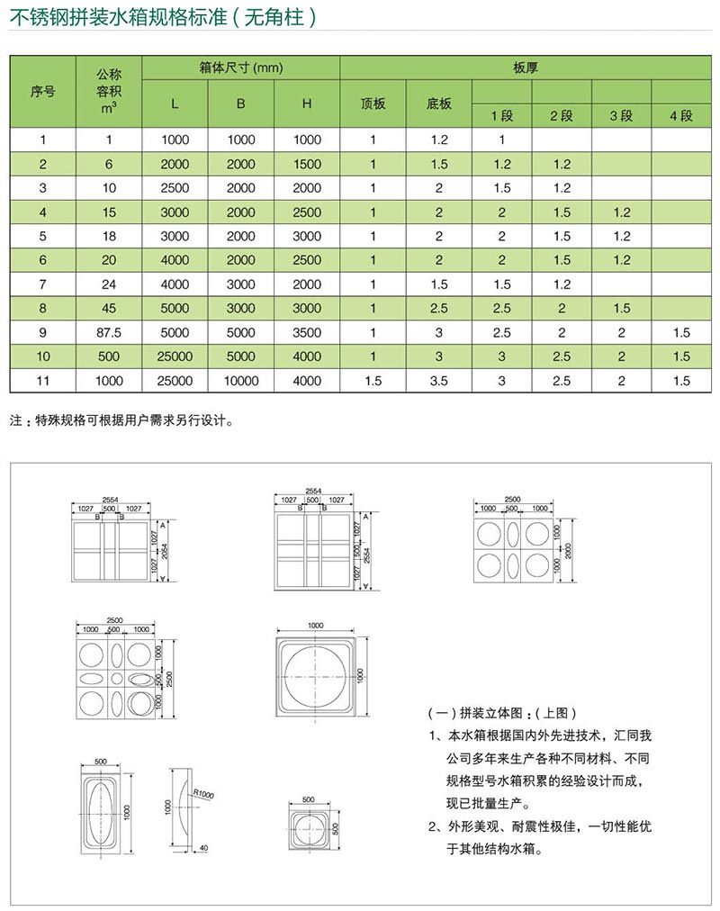 不銹鋼水箱系列產(chǎn)品其單板規(guī)格:500×500mm、1000×500mm、 1000×1000mm,水箱可任意拼裝成1-1500噸,